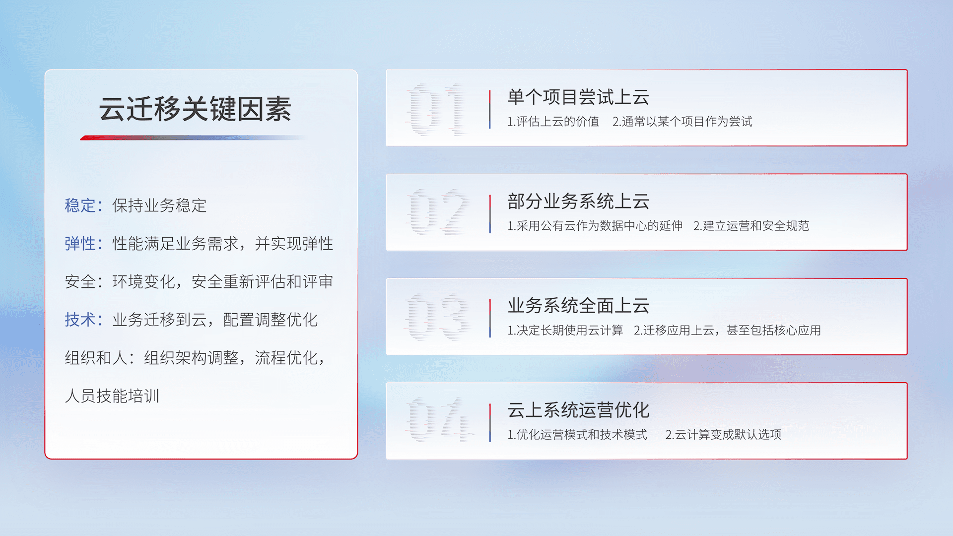 结合实际业务,,从规划设计、、、、云平台选型、、、、云原生改造、、数据迁移、、、、集成交付,,迁移全过程为客户识别最佳上云路径,,,做好风险识别管理,,设计网络架构、、、、身份权限、、、、安全审计合规、、、、操作审计、、、、日志审计、、、监控告警策略、、、多站点容灾设计等,,,,对云上基础设施进行整体规划,,提升IT治理水平,,,以满足弹性、、、高可用、、、高性能的需求。。