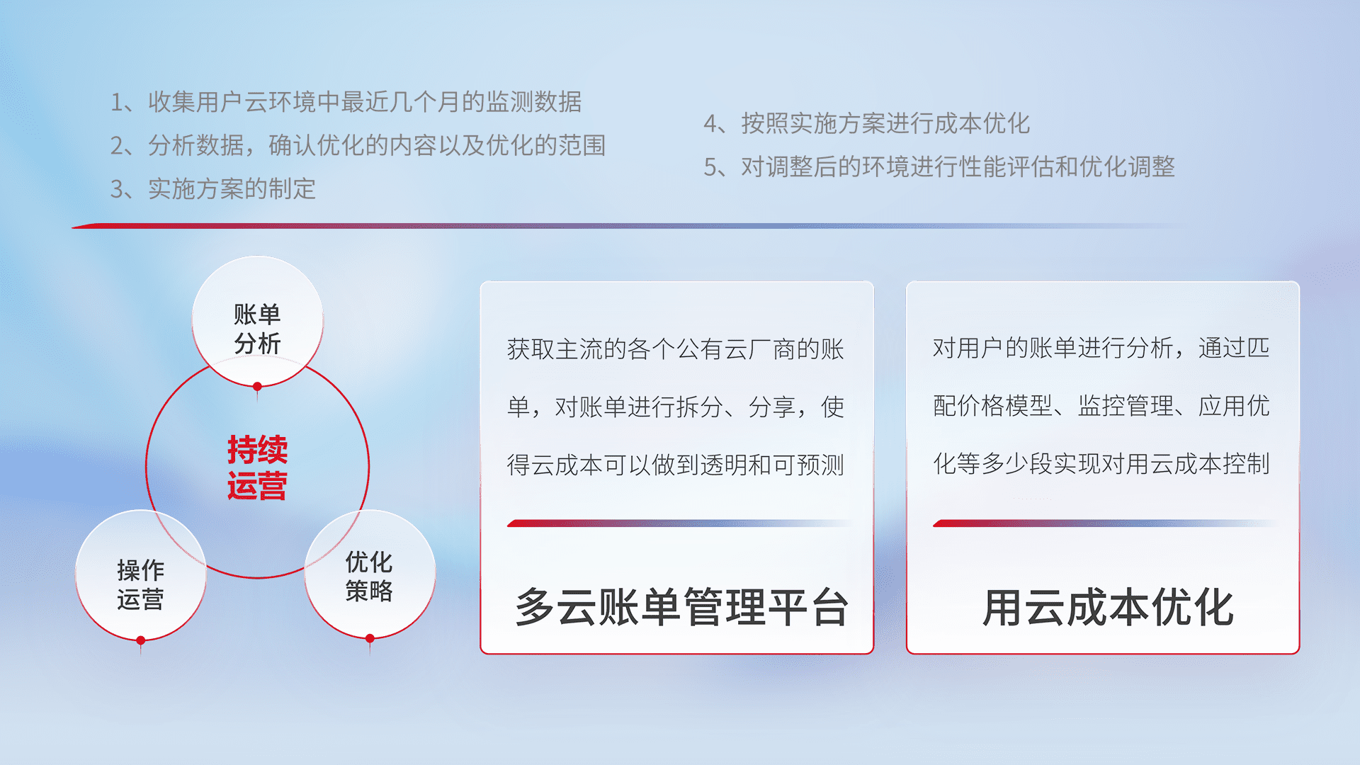 通过多云纳管,,,以统一的资源数据模型把客户的云资源进行抽象和封装,,进而实现对多云资源的统一操作,,,,保障云资源管理的可靠性、、、稳定性与可用性。。。。量身定制化运维内容,,,配置、、、、开发运维、、补丁管理、、、、备份、、、、监控、、认证和访问管理、、、、审计和日常巡检等,,,保障在用云过程中的可靠度,,稳定度以及高可用率。。